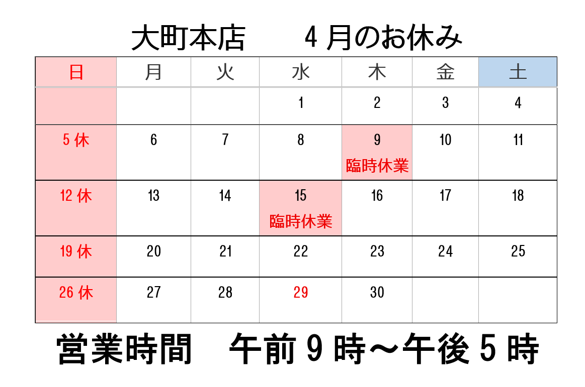 臨時休業日がございます。ご迷惑お掛けしますがご理解賜りますようお願い申し上げます。