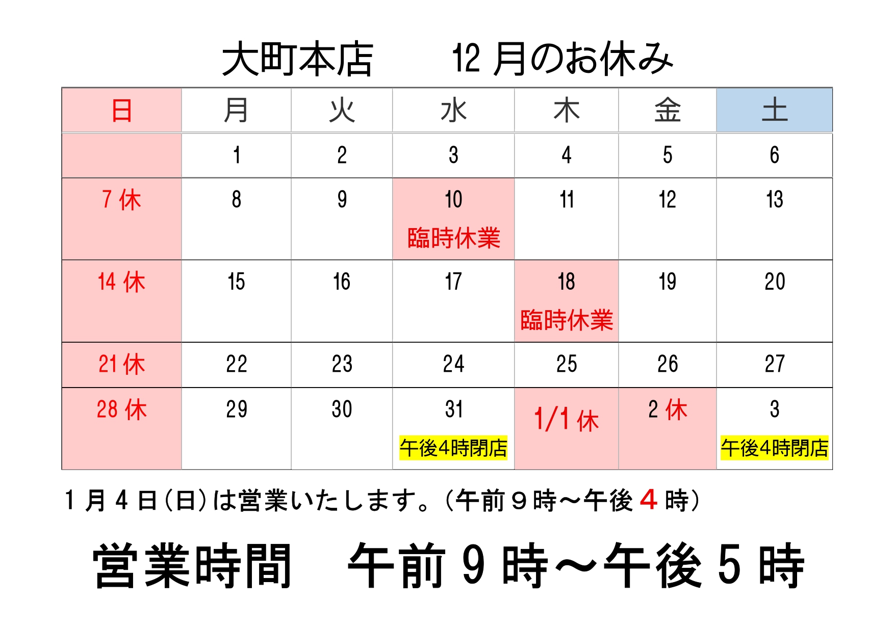 年末年始の営業日及び営業時間のお知らせ
