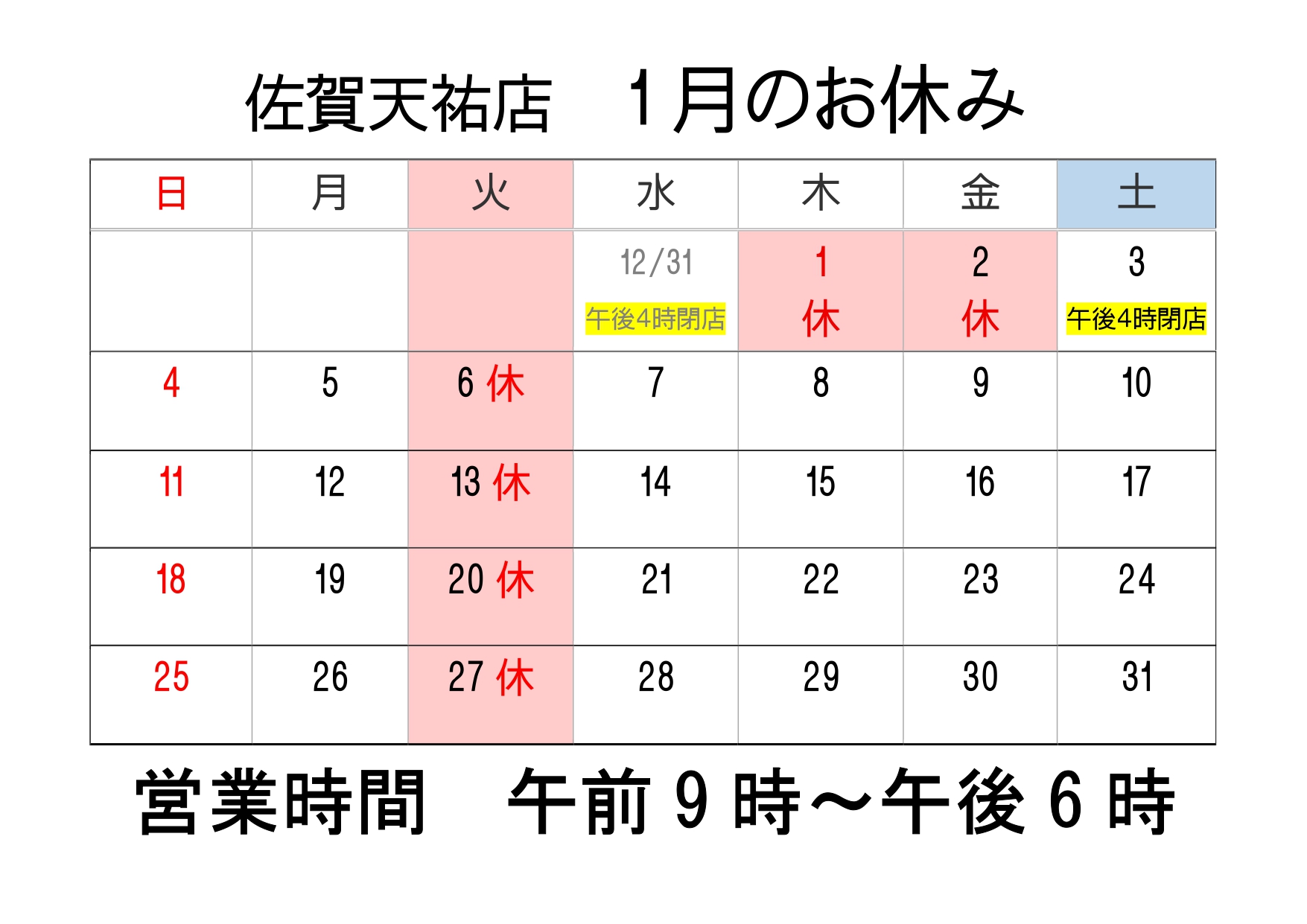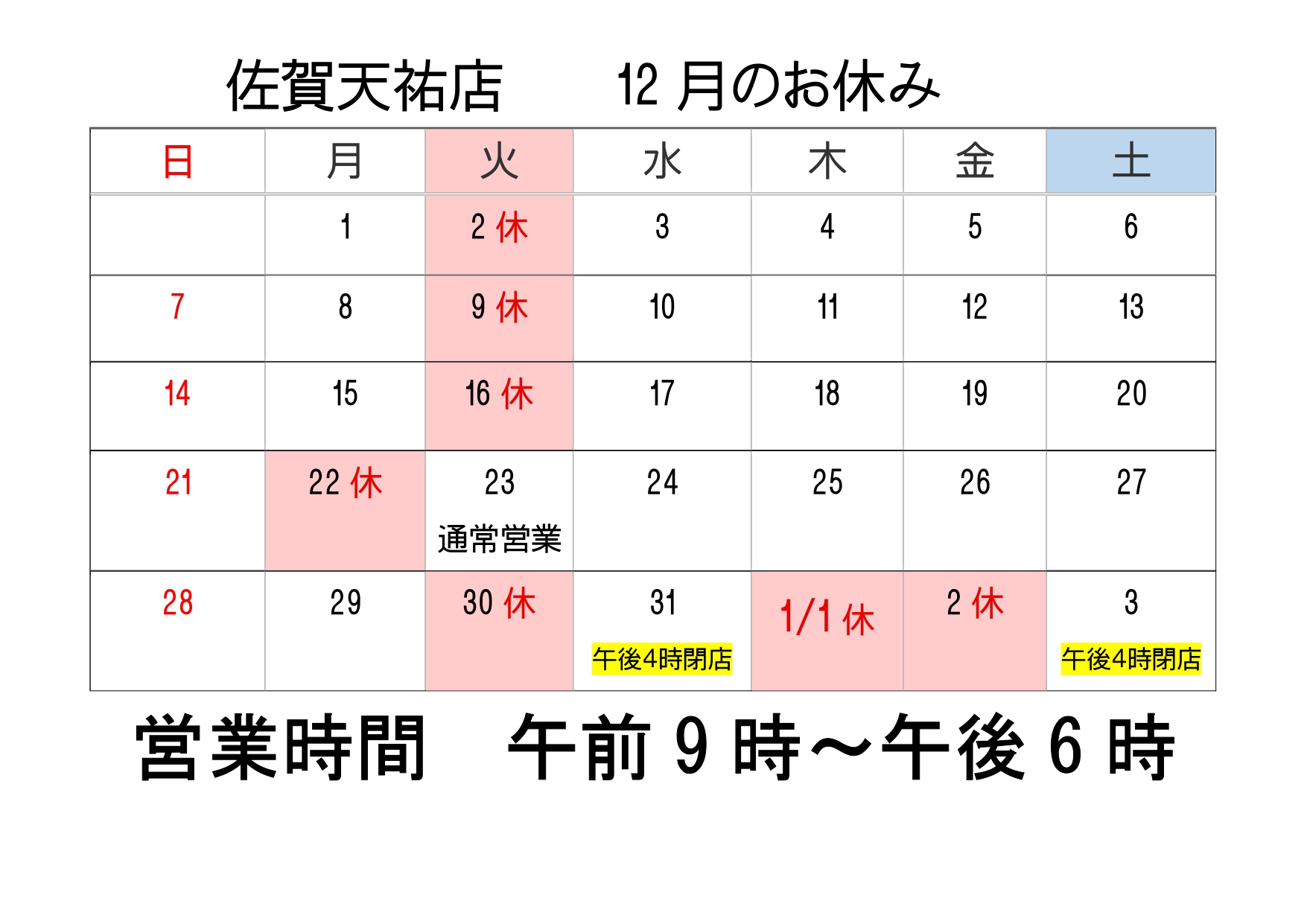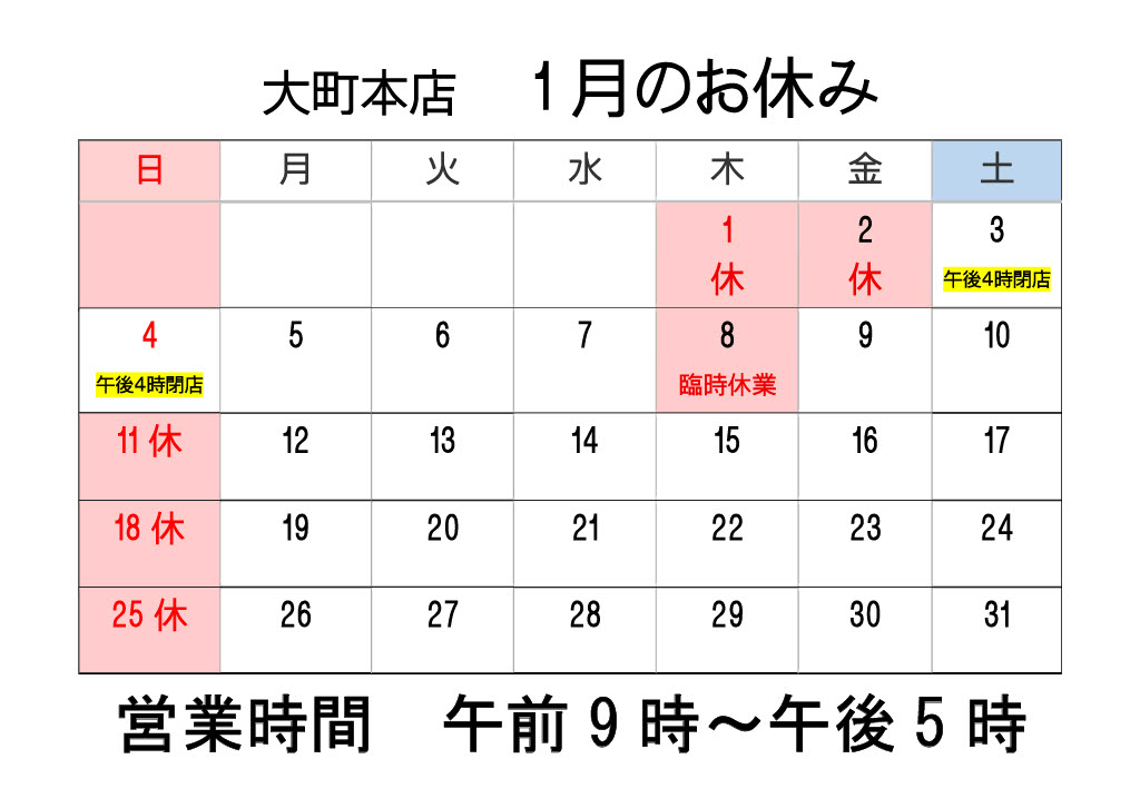 年末年始の営業日及び営業時間のお知らせ